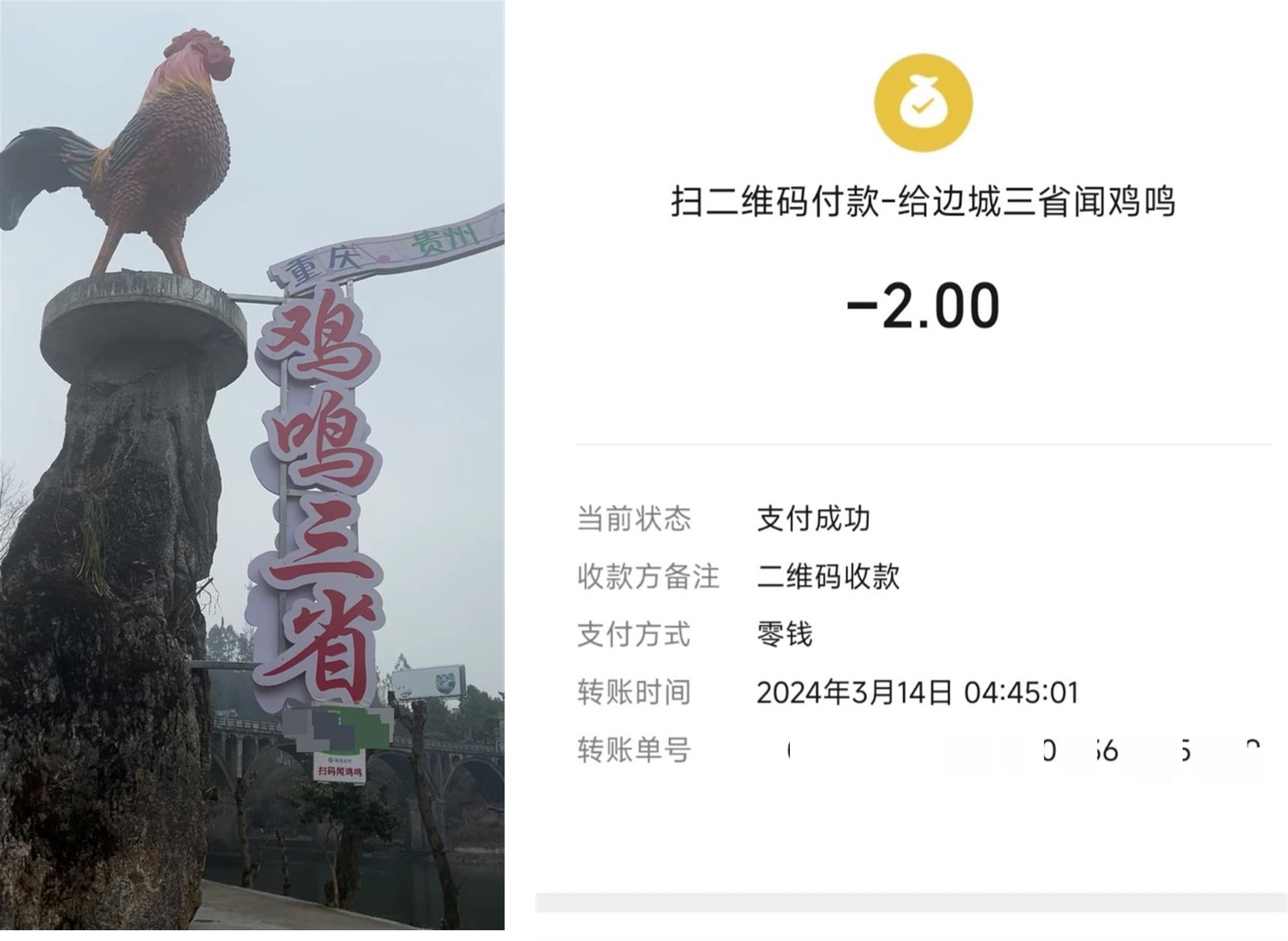 最近網(wǎng)上有個娛樂事件:在重慶、貴州、湖南三地交界的邊城,一農(nóng)家樂門口安放了一只公雞雕塑,并懸掛二維碼,游客掃碼支付二元后...